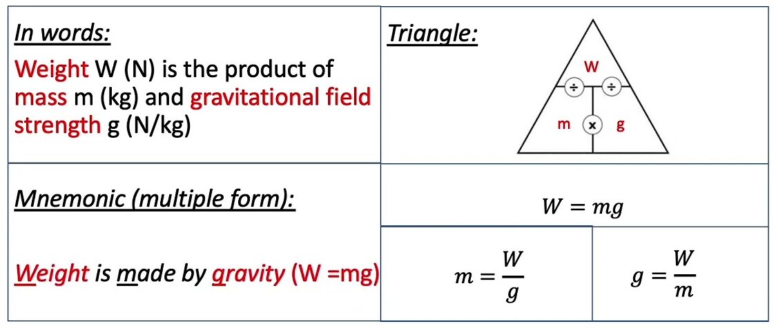 - Define gravitational field strength g as the gravitational force per unit mass; recall and use the equation $g = \frac{W}{m}$ and know that near to the surface of the Earth, g is approximately 9.8 N/kg