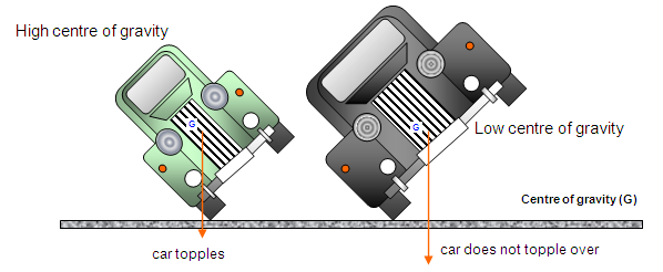 - Lower centre of gravity ⟶ greater stability, because the line of action of weight is less likely to fall outside the base when tilted.