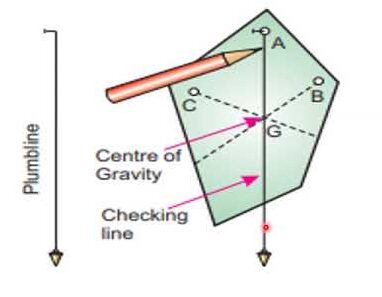 - When suspended, the lamina rotates until its weight acts directly below the suspension point. The plumb line shows the direction of the weight (vertical). The CG must lie somewhere on that vertical line. Two different suspension points give two verticals; their intersection is the unique point that lies on both lines the CG.