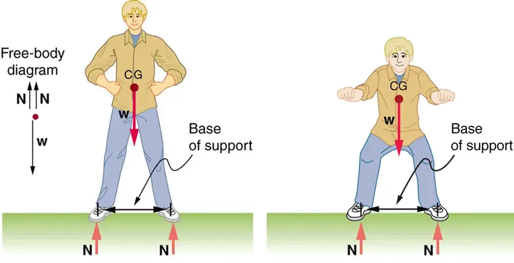 - Higher centre of gravity ⟶ less stability, because a small tilt may cause the line of action of weight to pass outside the base, leading to toppling.