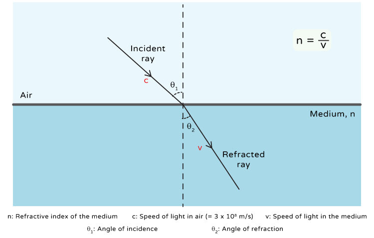 - Angle of refraction (\(\theta_r\)): The angle between the refracted ray and the normal.