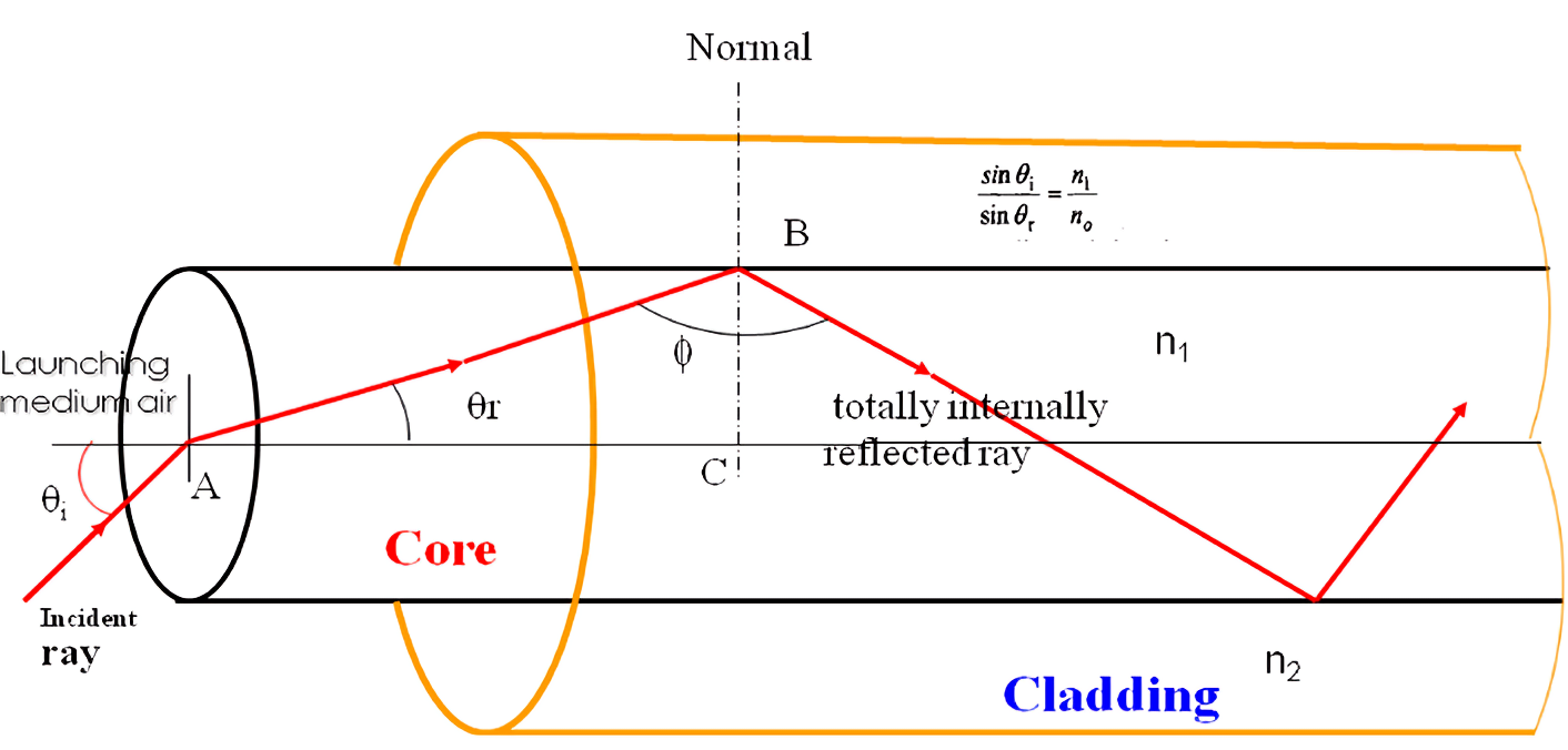 - Since the core has a higher refractive index, if the angle of incidence is greater than the critical angle, the light undergoes total internal reflection.