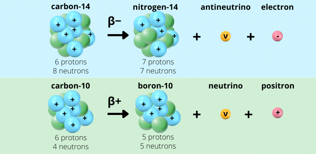 - Result: The nucleus becomes a different element, 1 place higher in the periodic table.
