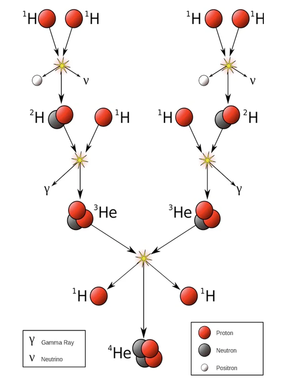 - Simplified reaction: \( 4 \, ^{1}_{1}H \; \rightarrow \; ^{4}_{2}He + 2 \, e^{+} + 2 \, \nu_{e} + \text{energy} \)