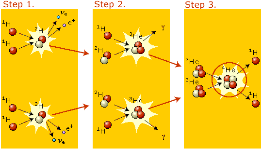 - Here, four hydrogen nuclei (protons) combine to form one helium nucleus, releasing positrons, neutrinos, and large amounts of energy.