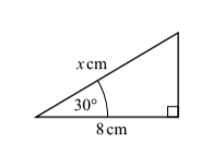 - If 8 cm is hypotenuse: cos(30°) = adjacent/hypotenuse ⇒ √3/2 = x/8 ⇒ x = 8×√3/2 = 4√3