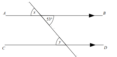 Use angle rules for parallel lines to find angles \( x \) and \( y \).
