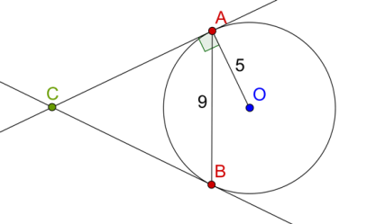 Consider a chord AB of length 9 cm in a circle of radius 5 cm. Tangents at A and B intersect at point C, as shown below.