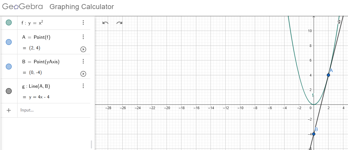 Step 2: Using a ruler, draw a tangent to the curve at the point \( (2, 4) \). The line should just touch the curve at that point and follow its direction.