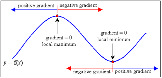 Maximum and minimum points (also called turning or stationary points) occur where the gradient of a curve is zero — i.e., where the first derivative is zero: