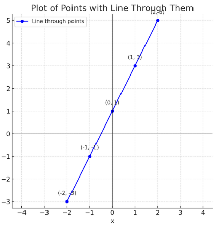 Plot these points: (-2, -3), (-1, -1), (0, 1), (1, 3), (2, 5), then draw a straight line through them.