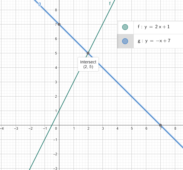 \( 2x + 1 = -x + 7 \Rightarrow 3x = 6 \Rightarrow x = 2 \)
