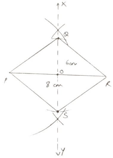 Construct a rhombus PQRS where each side is 6 cm and diagonal PR is 8 cm. Use only a ruler and compasses. Show construction arcs.