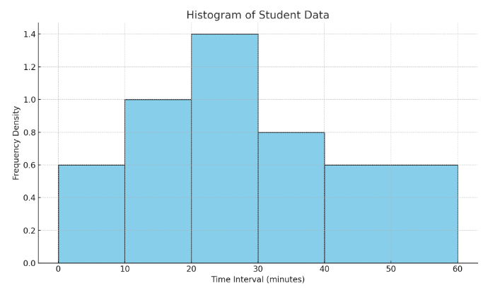 - Draw bars for each class interval (bar width = class width, bar height = frequency density).