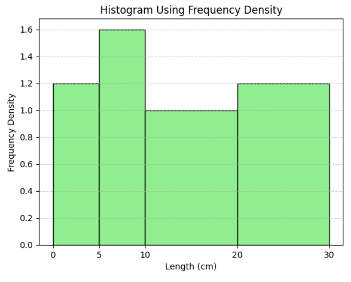 Note: Frequency density helps construct histograms when class widths are unequal.