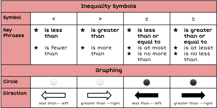 - Closed circle: used for inclusive inequalities (≤ or ≥)