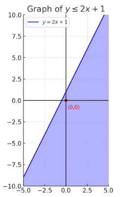 \( 0 \leq 2(0) + 1 \Rightarrow 0 \leq 1 \) → True - Step 4: Shade the region below or on the line