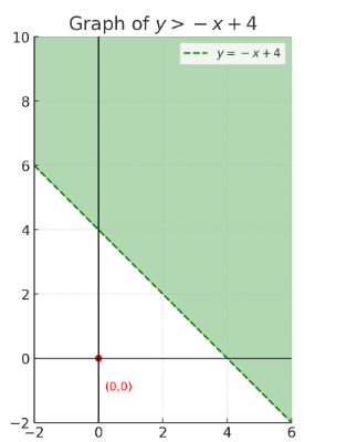 \( 0 > -0 + 4 \Rightarrow 0 > 4 \) → False - Step 4: Shade the region above the line