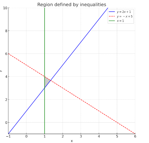 If a region is already drawn or shaded on a graph, you may be asked to write down the inequalities that define it. These inequalities describe the boundaries and the side of each line the region lies on.
