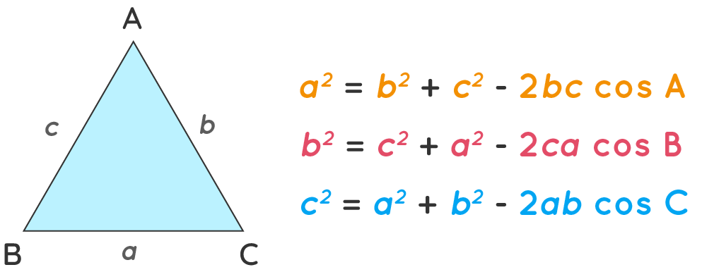 - \( a^2 = b^2 + c^2 – 2bc \cos A \)