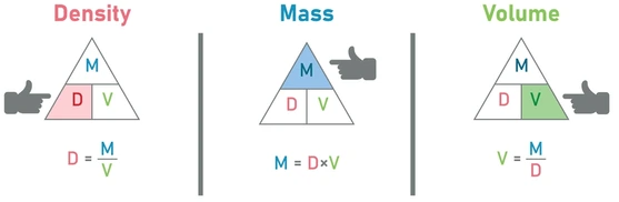 Density describes how much mass is packed into a given volume. The formula is: \( \text{Density} = \frac{\text{Mass}}{\text{Volume}} \)