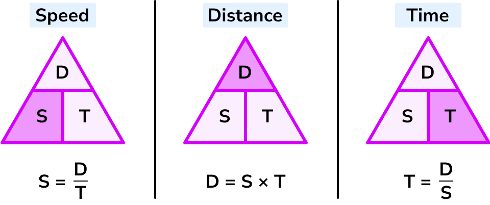 \( \text{Speed} = \frac{\text{Distance}}{\text{Time}}, \quad \text{Distance} = \text{Speed} \times \text{Time}, \quad \text{Time} = \frac{\text{Distance}}{\text{Speed}} \)