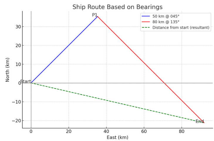 A ship sails 50 km on a bearing of 045°, then changes course and sails 80 km on a bearing of 135°. How far is the ship from its starting point?