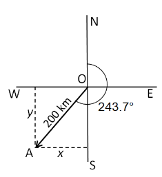 A ship sails 200 km on a bearing of 243.7°.