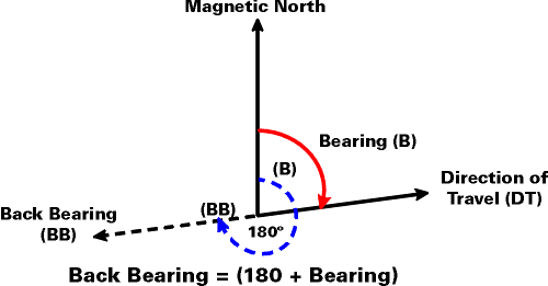 - The bearing from one point back to another point (difference of 180°).