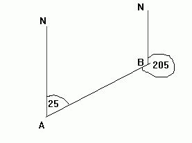 A bearing is an angle, measured clockwise from the north direction. Below, the bearing of B from A is 025 degrees (note 3 figures are always given). The bearing of A from B is 205 degrees.
