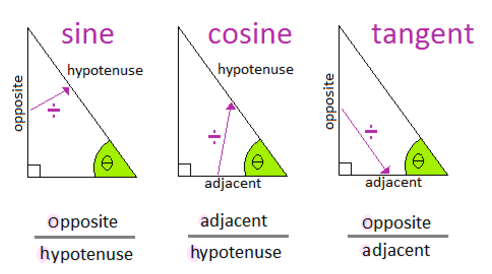 - \( \cos \theta = \frac{\text{adjacent}}{\text{hypotenuse}} \)