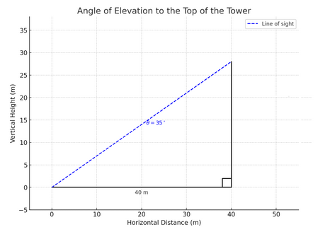 \( \text{height} = 40 \times \tan(35^\circ) \approx 40 \times 0.7002 = \boxed{28.01 \, \text{m}} \)