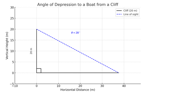 A girl stands on top of a 20 m high cliff and observes a boat at sea. The angle of depression is \( 28^\circ \). How far is the boat from the base of the cliff (horizontal distance)?