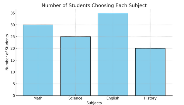 Draw vertical bars of appropriate heights: Math (30), Science (25), English (35), History (20).
