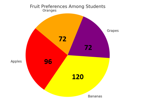 - Bananas: \( \frac{10}{30} \times 360^\circ = 120^\circ \)
