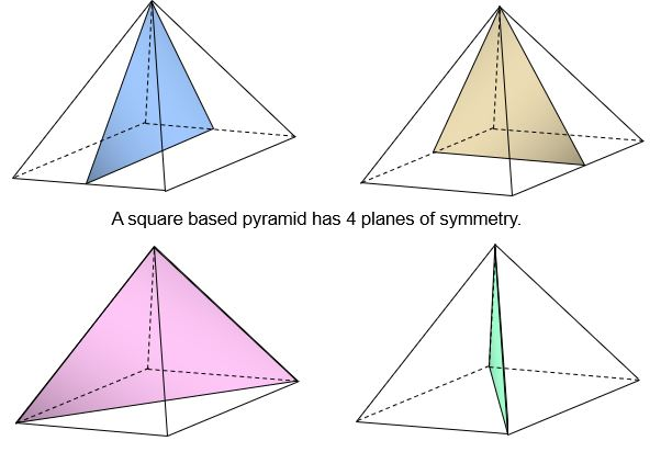 - Square pyramid: 4 planes of symmetry and 1 vertical axis.