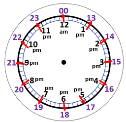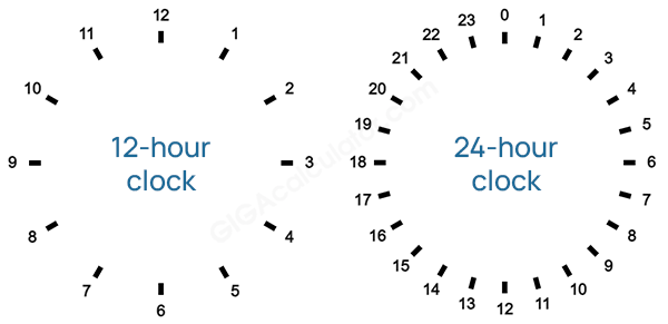 The 24-hour clock runs from 00:00 (midnight) to 23:59. It is commonly used in timetables, airports, and military schedules.