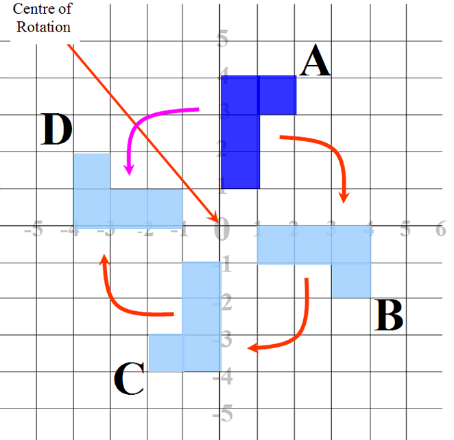 - A shape can be rotated about any point: origin (0, 0), a vertex, or the midpoint of an edge.