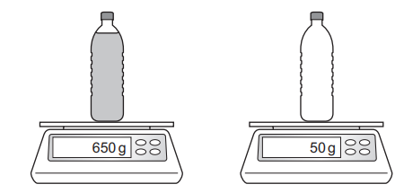A plastic bottle contains \(750 cm^3\) of oil. The diagram shows the mass of the bottle being measured when it is full and then when it is empty.