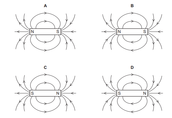 Which diagram shows the pattern and the direction of the magnetic field lines around a bar magnet?