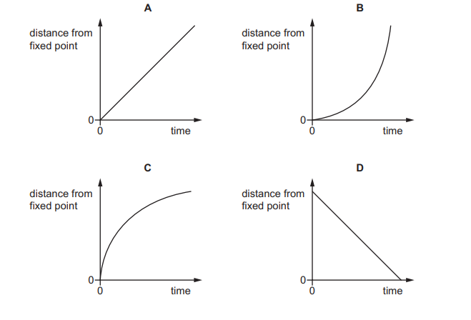Four objects are moving along a straight line. The distance of each object from a fixed point on the line is plotted against time. Which object is decelerating?