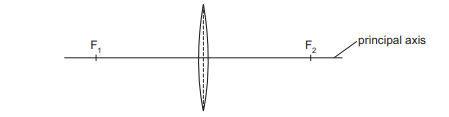 D The beam travels parallel to the principal axis.