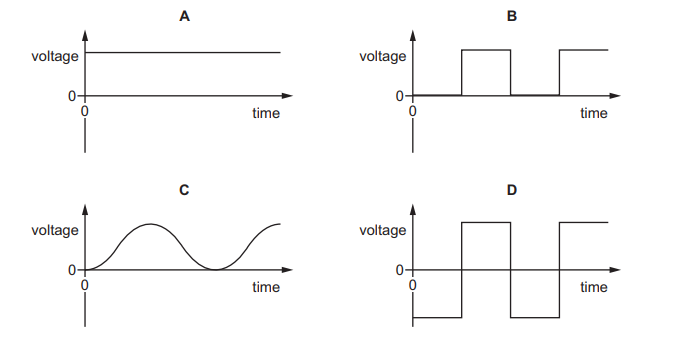 Which graph of voltage against time shows an a.c. voltage?