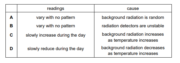 A radiation detector in a laboratory is measuring background radiation. Which row describes the readings and the cause?