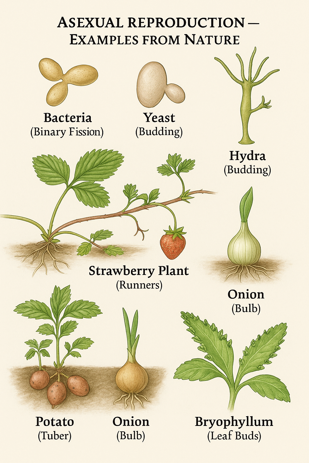 | Plants | E.g. Strawberries using runners, potatoes using tubers |