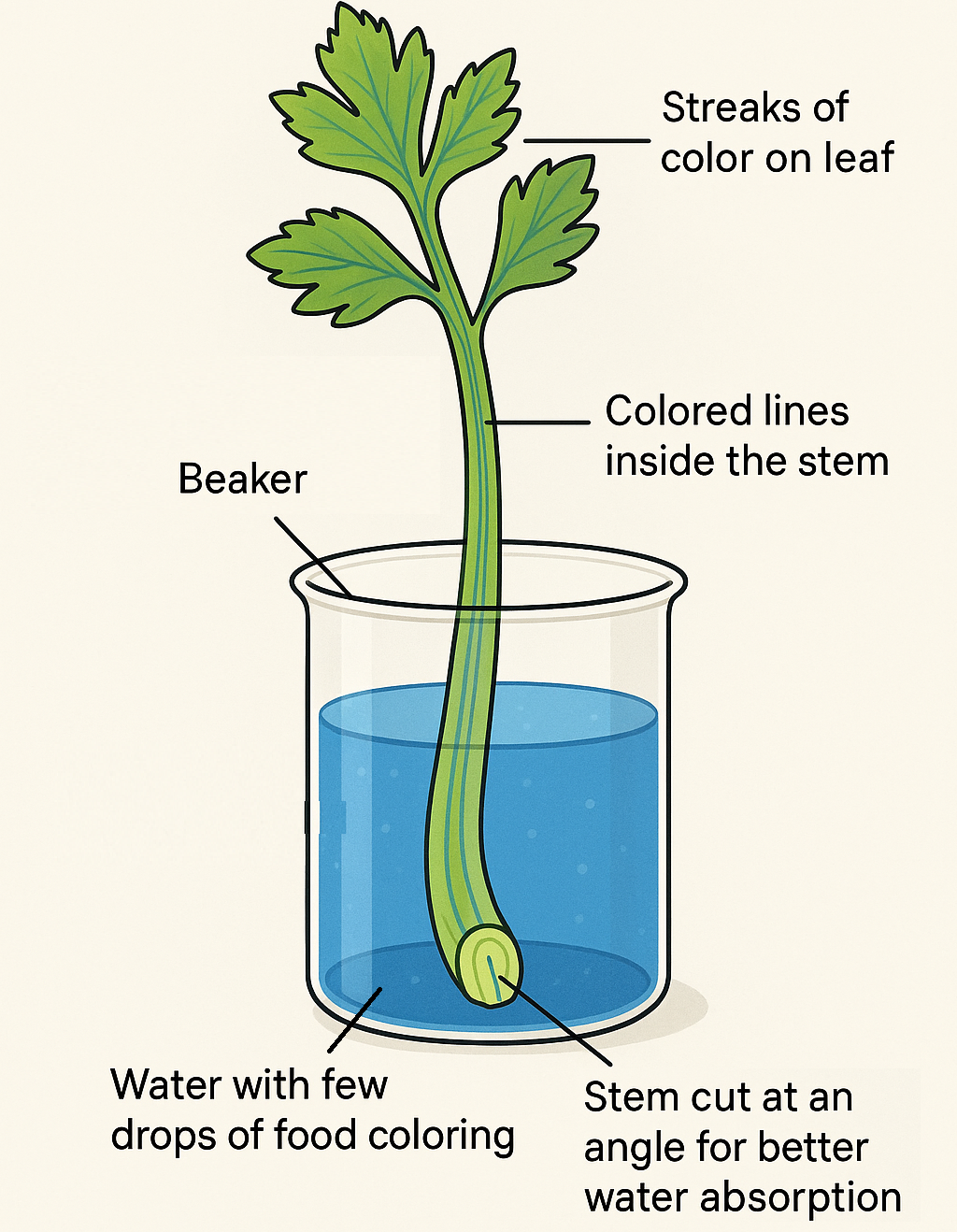 - The stem cross-section shows colored circles or lines where the dye moved.