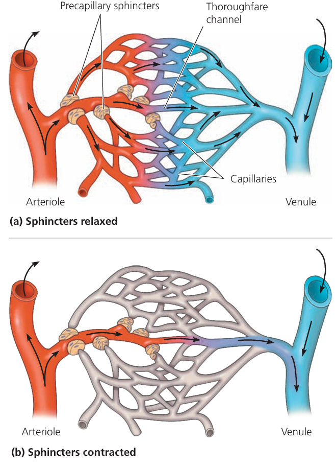 | Located between arterioles and venules | Main site of exchange in circulation. |