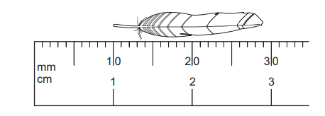 The diagram shows an enlarged drawing of the end of a metre ruler. It is being used to measure the length of a small feather.