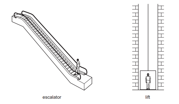 The escalator takes 20 seconds to carry the man between the two floors. The useful work done against gravity is W. The useful power developed is P.