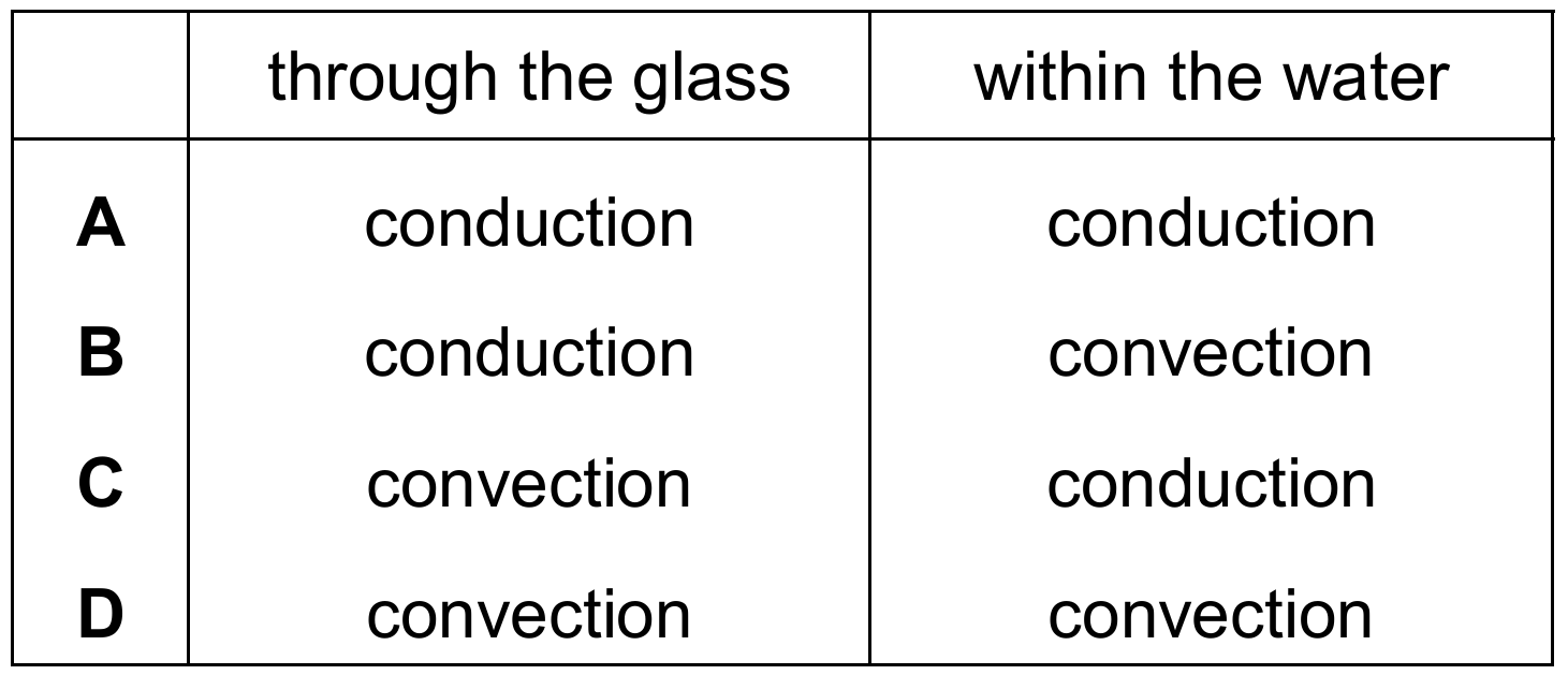 Heat transfer through the solid glass occurs via conduction, where thermal energy is passed through atomic vibrations. In the liquid water, the main method is convection; as water at the bottom heats up, its density decreases, causing it to rise and create a circulation current. While radiation exists, it is not the primary mechanism for these specific media. Consequently, the heat moves through the solid beaker by conduction and circulates within the fluid water by convection. This identifies Row B as the correct description of the primary thermal processes involved.